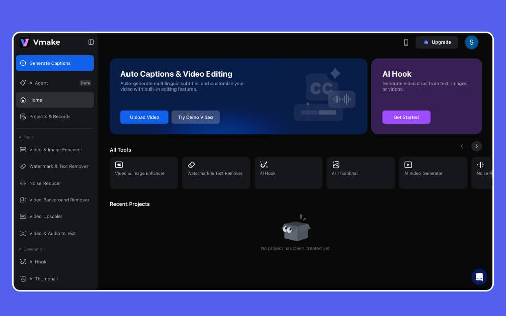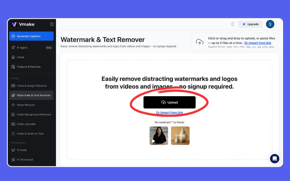 Vmake 물 제거 도구는 Vmake 비디오 편집 도구 모음의 일부입니다. Vmake 제품군은 비디오 제작, 편집 및 향상에 도움이 되는 다양한 비디오 편집 및 향상 도구로 구성되어 있습니다.