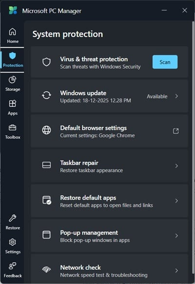 Microsoft PC Manager의 보호 섹션은 시스템 업데이트 및 보안 관련 모든 작업을 한 곳에서 처리할 수 있도록 해줍니다. 이 섹션을 열면 PC 검사, Windows 업데이트 확인, 기본 브라우저 설정 변경, 작업 표시줄 복구, 앱 기본 설정 복원, 팝업 차단, 네트워크 속도 테스트 및 문제 해결 옵션을 사용할 수 있습니다.