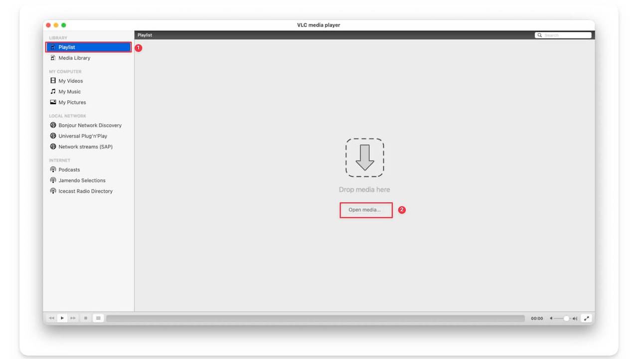 2단계: Windows에서 VLC 플레이어를 열고 재생 목록 탭으로 이동한 다음 미디어 열기를 클릭합니다.