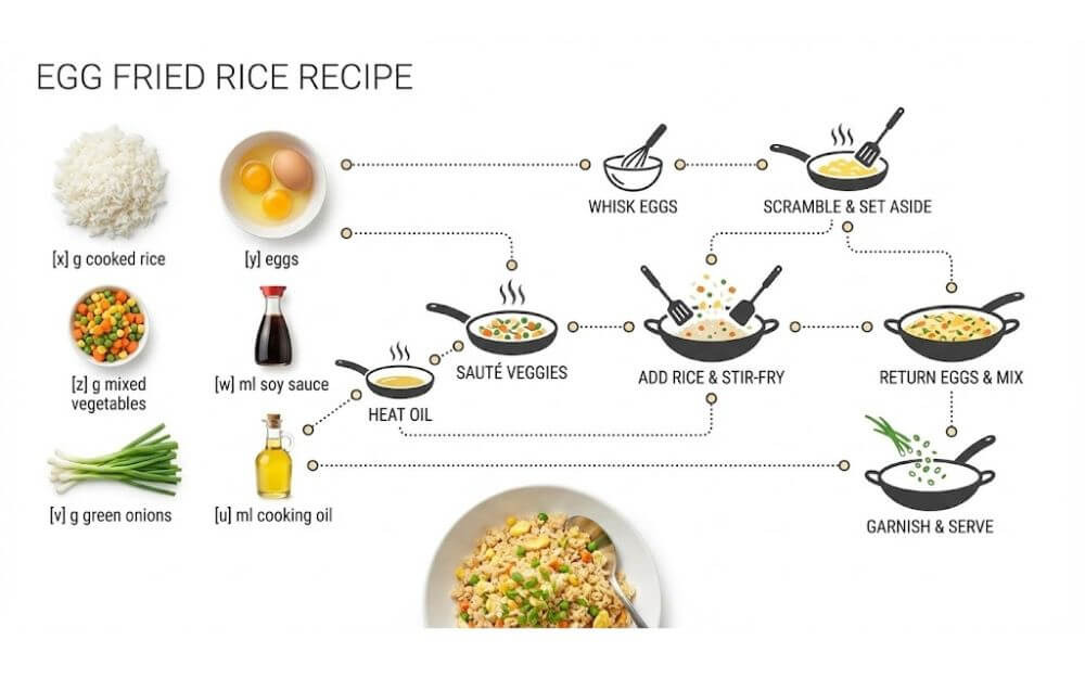 대부분의 사용자가 쉽게 활용할 수 있도록, 어떤 요리든 단계별 레시피를 생성할 수 있는 예시를 아래에 소개합니다. 레시피를 직접 입력하거나 단계를 추가하여 활용하실 수 있습니다.