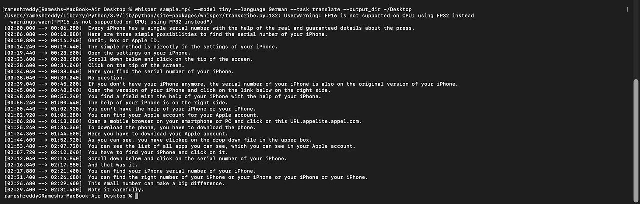 명령: whisper (your video or audio file name) –model medium –language (enter your language here) –task translate