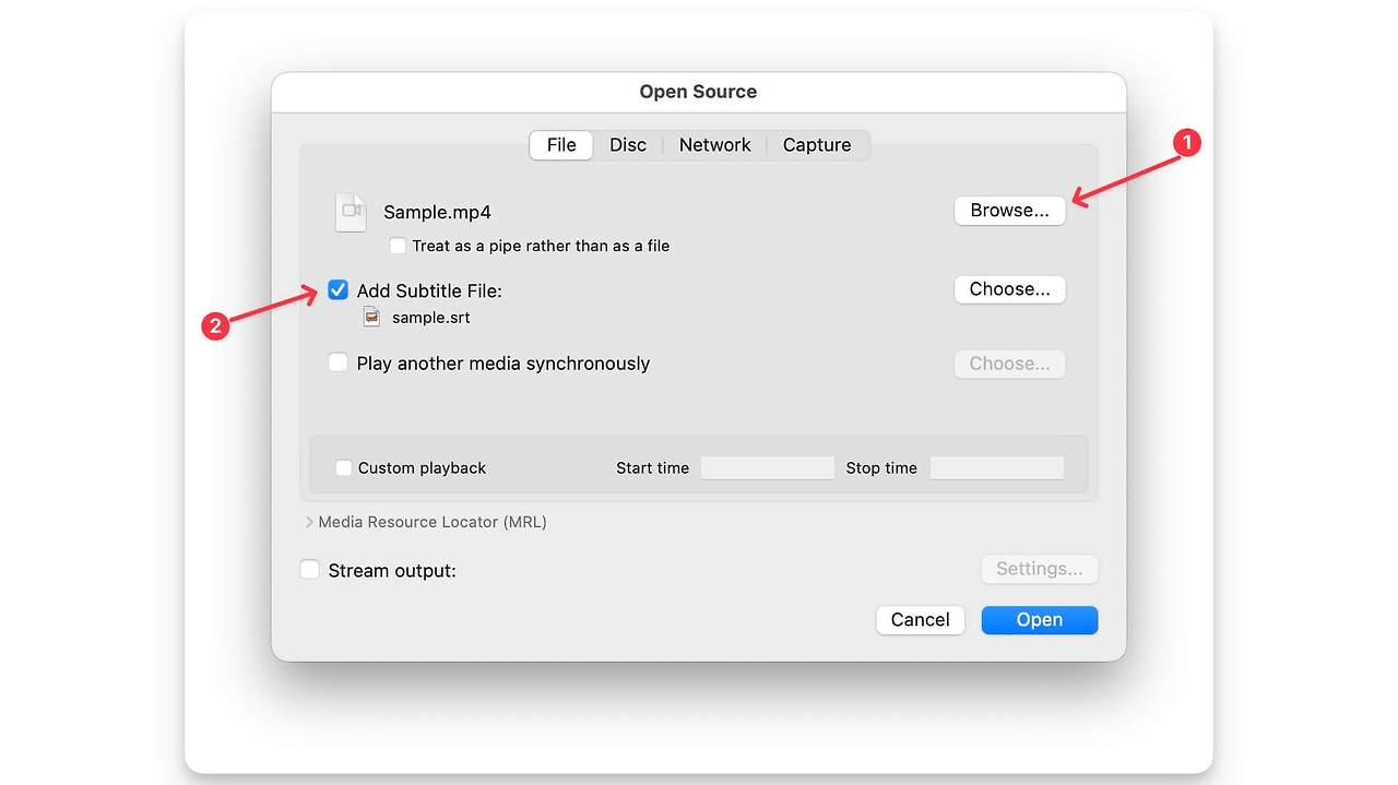 3단계: 여기에서 찾아보기를 탭하고 비디오 파일을 선택한 다음 자막 파일 추가를 활성화하고 Whisper AI를 사용하여 생성한 자막 파일을 선택한 다음 열기를 클릭합니다.