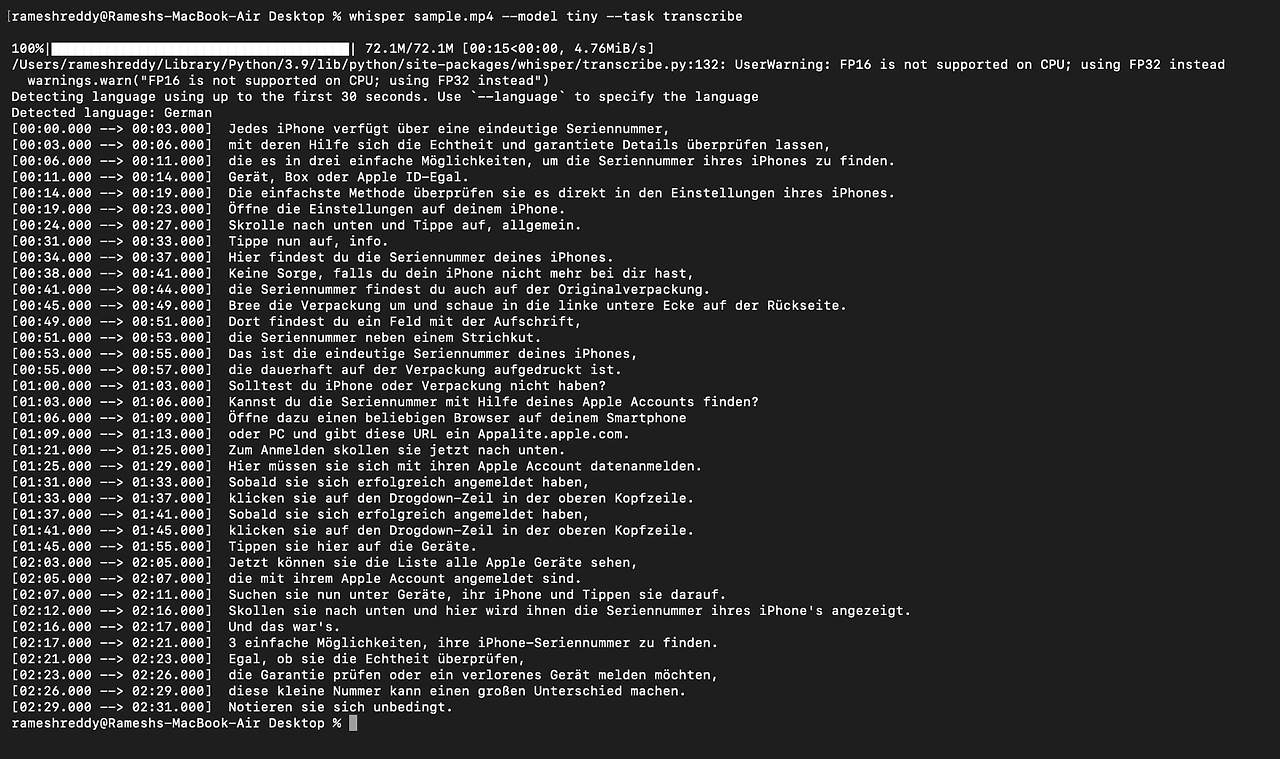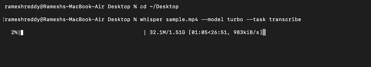3단계: 이제 다음 명령을 사용하여 비디오 파일을 선택하여 전사합니다. whisper(여기에 비디오 또는 오디오 파일 이름을 추가합니다) –model turbo –task transcribe