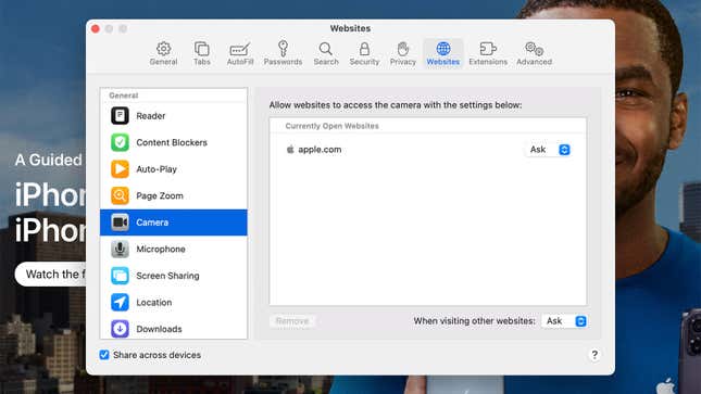 마지막으로 Apple Safari 브라우저에서 Safari, 설정, 웹사이트를 차례로 선택하여 카메라 및 마이크 와 같은 권한에 액세스할 수 있는 사이트를 제어합니다. 특정 사이트에 저장된 쿠키를 조정하려면 설정 대화 상자 에서 개인 정보 를 선택한 다음 웹 사이트 데이터 관리를 선택해야 합니다. 제거 옵션과 함께 컴퓨터에 쿠키를 저장한 웹 사이트 목록이 표시됩니다.