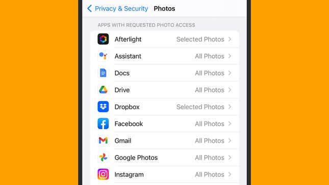 iOS에서는 설정으로 이동한 다음 개인 정보 보호 및 보안을 탭해야 합니다. 카메라 사용 권한부터 Apple 건강 앱에 저장된 데이터 액세스 권한까지 앱에 부여할 수 있는 긴 권한 목록이 표시됩니다. 권한을 선택한 다음 앱을 선택하여 앱의 권한을 구성합니다. 예를 들어 사진 의 경우 선택한 사진, 모든 사진 또는 없음을 선택할 수 있습니다.
