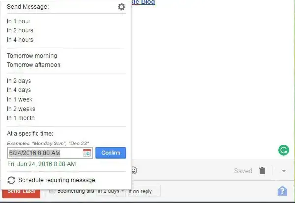 유감스럽게도 Gmail에는 내장 일정 기능이 없습니다. 따라서 이러한 스케줄링 기능을 얻으려면 Boomerang을 사용해야 합니다. 실제로 Gmail의 유료 서비스이지만 한 달에 10개의 이메일만 예약하려는 경우 무료 버전을 사용할 수 있습니다. Gmail 받은편지함에 기능을 추가하면 미리 예약된 시간에 이메일을 보내는 옵션이 표시됩니다.
