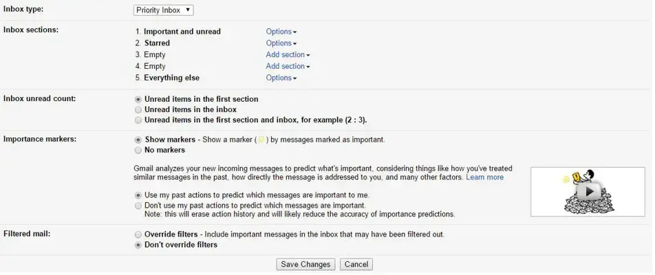 모르는 경우를 대비하여 Gmail은 다양한 받은 편지함 모드를 제공합니다. 다섯 가지 모드 중 하나를 자유롭게 선택할 수 있습니다. 일부 사람들은 Gmail 받은 편지함의 일반 레이아웃을 좋아하기 때문에 이 Gmail 트릭은 선택 사항입니다. 그러나 효과적인 점검을 원하는 경우 설정 à 받은 편지함 탭으로 이동하여 다음 받은 편지함 모드 중 하나를 선택할 수 있습니다.