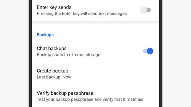작성 당시 Android에서는 동일한 기능을 사용할 수 없습니다. 여기에서 Signal 설정에서 채팅 및 미디어 와 채팅 백업을 선택한 다음 다른 쪽 끝에서 백업을 해독하는 데 필요한 암호를 기록해 두어야 합니다. 그런 다음 Signal이 인식하고 액세스할 수 있는 선택한 앱을 사용하여 해당 백업 파일을 새 휴대폰으로 수동으로 이동해야 합니다. 여기에서 Signal의 전체 지침을 찾을 수 있습니다.