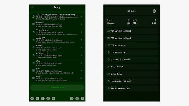 의심할 여지 없이 iOS에서 얻을 수 있는 가장 포괄적인 네트워크 스캐너 중 하나인 Scany는 라우터 포트, 네트워크에 연결된 장치, 방화벽 상태 등에 대해 다시 보고하며 완전한 네트워킹 도구 세트(ping, traceroute, whois, 및 원격 깨우기). 비용은 6달러이지만 네트워크를 설정하고 문제를 해결하는 데 많은 시간을 할애한다면 가치 있는 투자입니다.