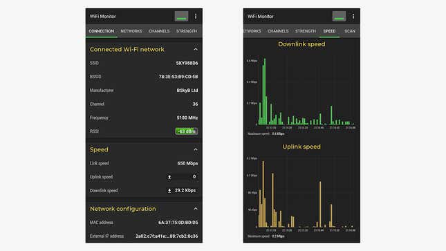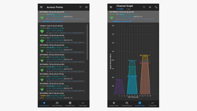 WiFi Monitor는 가장 포괄적인 도구 중 하나인 유능하고 유익한 Wi-Fi 분석기 도구입니다. 집안을 돌아다니면서 실시간으로 신호 강도와 연결 속도를 모두 추적하여 관심 없는 네트워크를 필터링할 수 있으며 Wi-Fi 채널 간섭을 보여주는 차트도 있습니다. 모든 기능은 무료로 사용할 수 있지만 광고를 제거하기 위해 소액의 기부를 선택할 수 있습니다.