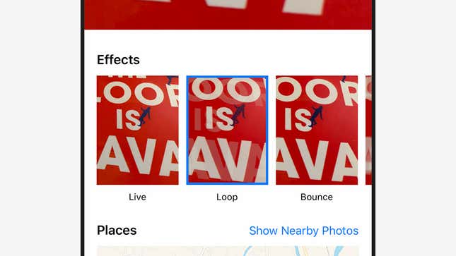총 3초 분량의 프레임이 있는 여러 장의 사진을 Live Photo로 캡처했다고 가정하면 휴대폰의 사진 앱에서 GIF로 변환할 수 있습니다. 화면에 사진이 있는 상태에서 위로 살짝 밀어 루프 (애니메이션 반복) 또는 바운스 (애니메이션이 앞뒤로 이동)를 애니메이션으로 선택합니다.