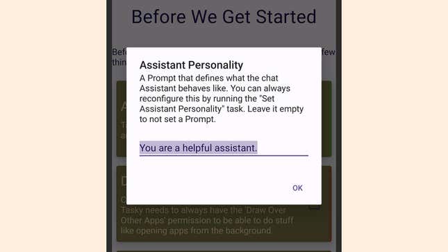 Tasker를 처음 시작할 때 전체 경험을 선택하고 표시되는 모든 설정 프롬프트를 수락하십시오. 다음으로 휴대전화의 브라우저를 사용하여 Tasker의 사용자 지정 ChatGPT 프로젝트에 대한 이 링크를 엽니다. 가져오기를 선택한 다음 예를 선택 하여 작업을 확인합니다. 그런 다음 ChatGPT에 응답하는 방법을 알려주는 프롬프트를 만들 수 있습니다. 이름을 지정하고 어조를 변경하는 등의 작업을 할 수 있습니다. 기본값은 "당신은 도움이 되는 조수입니다"입니다. 괜찮습니다.