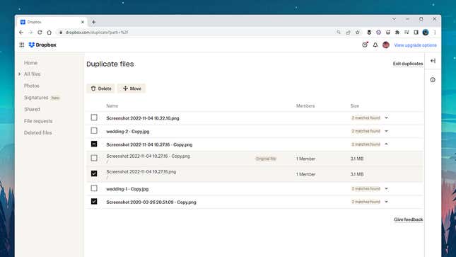 오른쪽에서 발견된 각 파일의 사본 수를 확인할 수 있습니다. 드롭다운 메뉴를 클릭하면 개별 사본을 볼 수 있습니다. 사본을 선택하고 삭제할 수 있으며 변경 사항은 Dropbox가 설치된 장치에 동기화됩니다.