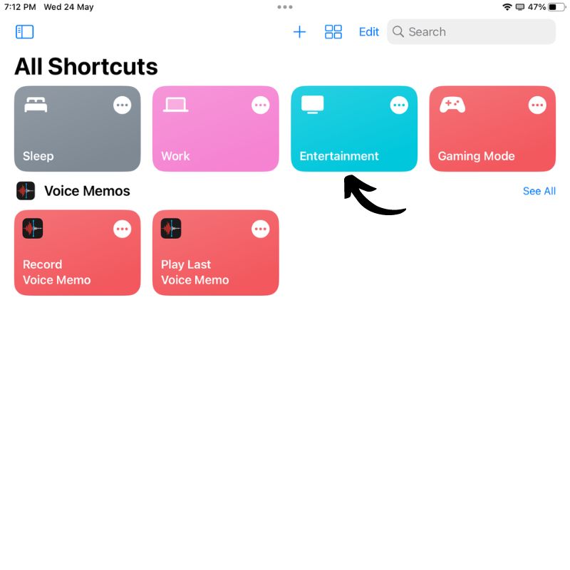 - 그런 다음 바로 가기 앱의 기본 화면으로 돌아가면 새로 생성된 바로 가기가 표시됩니다.