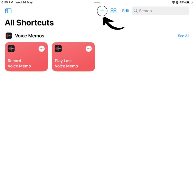 - 바로 가기 앱이 열리면 상단에 + 기호가 표시됩니다. 새 바로 가기를 만들려면 탭하십시오.