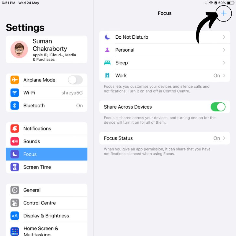 - 오른쪽 상단의 +를 탭하여 새로운 초점 모드를 만듭니다.