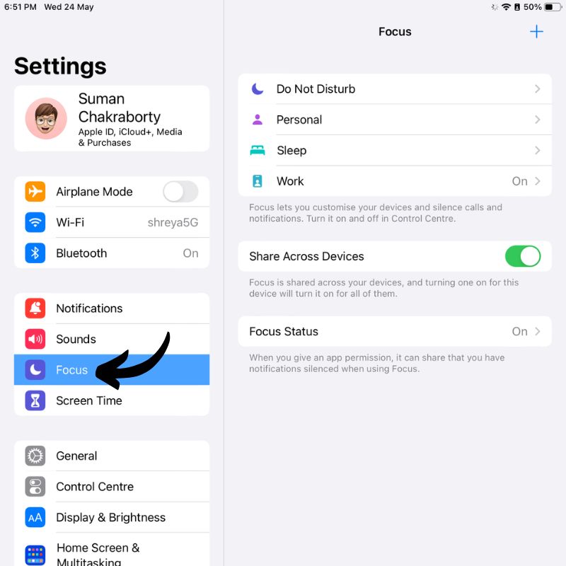 - 설정 앱 으로 이동하여 초점 설정을 엽니다.