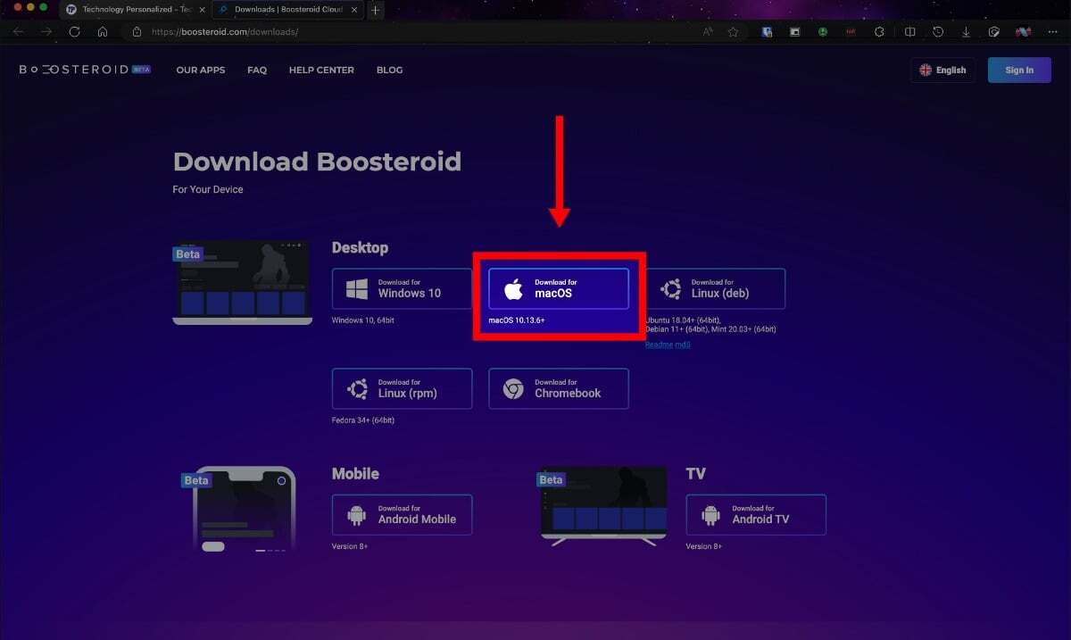 - 여기에서 Boosteroid 웹사이트를 방문하여 macOS 를 선택하십시오.