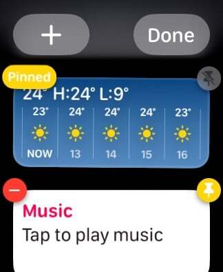 Apple에서는 위젯을 더 자주 사용하는 경우 스마트 스택 상단에 위젯을 고정할 수도 있습니다. 이렇게 하면 스마트 스택을 스크롤하여 찾는 수고를 덜 수 있습니다. 이렇게하려면 흔들림 모드로 들어가십시오. 그런 다음 오른쪽 상단 모서리에 있는 노란색 핀 아이콘을 탭하고 완료를 눌러 스택을 저장하세요.