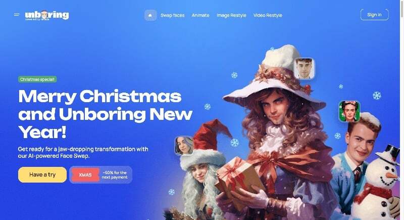 - Unboring by Reface.ai: 이 웹사이트는 사진에 애니메이션을 적용하고 비디오를 만화로 바꾸는 등의 기능을 통해 사진과 비디오에서 재미있는 얼굴 교환 기능을 제공합니다.