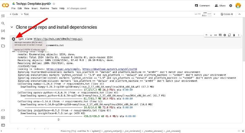 - 이제 저장소를 복제하고 종속성을 설치하십시오. 첫 번째 코드의 재생 버튼에 마우스를 올려놓고 코드를 실행해 보세요. 장치에 따라 실행하는 데 몇 분 또는 몇 분이 걸릴 수 있습니다.
