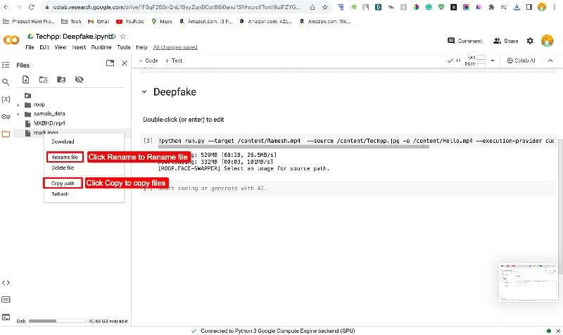 - 이제 아래로 스크롤하여 노트북의 Deep Fake 섹션에서 Python 실행 코드를 편집하고 코드에 파일 이름을 추가하거나 파일 경로를 복사합니다. (업로드한 영상과 사진의 파일명에는 특수문자나 숫자가 들어가지 않도록 주의하세요. 단순하게 유지해주세요. 원하는 경우 파일명을 변경할 수도 있습니다.) 파일을 마우스 오른쪽 버튼으로 클릭하고 이름 바꾸기를 선택한 후 복사 경로를 클릭하여 파일 경로를 복사합니다.