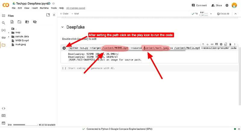 - 이제 기존 파일을 삭제하여 저장 공간을 절약할 수 있습니다. 새로운 딥페이크 영상을 생성하고 싶다면 교체하고 싶은 얼굴의 영상과 사진을 업로드하고 파일 경로를 복사한 후 코드를 추가하고 코드를 실행하면 됩니다. 동일한 단계에 따라 새로운 딥 페이크 비디오를 모두 만들 수 있습니다.