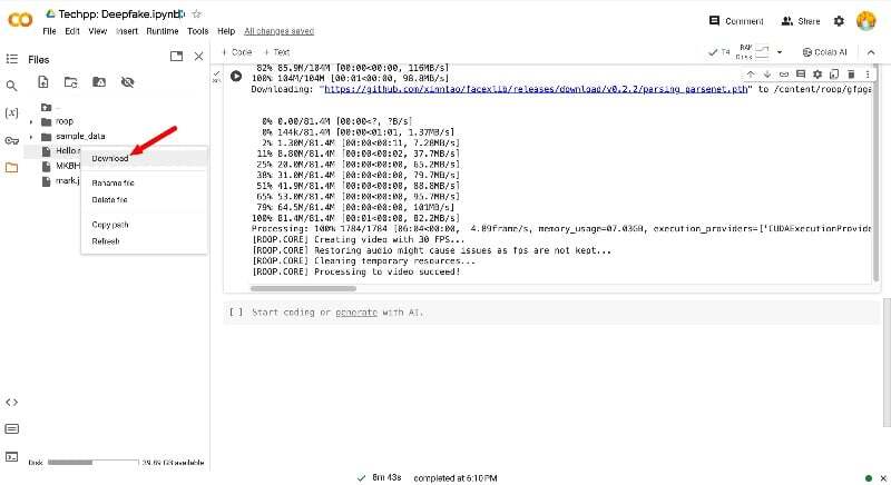 - 딥페이크 영상이 생성되어 폴더에 저장됩니다. 파일을 마우스 오른쪽 버튼으로 클릭하고 다운로드를 클릭하여 파일을 저장합니다.