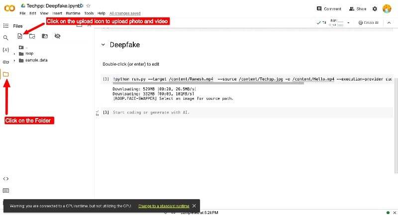 - 두 셀의 코드를 성공적으로 실행한 후 왼쪽 사이드바의 폴더 아이콘을 클릭하고 상단의 업로드 아이콘을 클릭한 후 얼굴을 바꾸고 싶은 동영상을 업로드하세요.