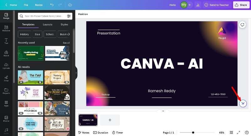 - "Magic Presentations" 기능을 검색하세요. 화면 오른쪽 하단에 있는 아이콘을 클릭하고 Magic AI를 탭하세요.