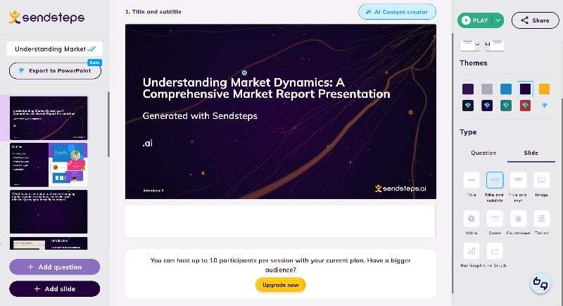 PowerPoint 프레젠테이션을 만든 후에는 PowerPoint 등 다른 플랫폼과 직접 공유하거나 공유 가능한 링크를 만들 수 있습니다. 도구를 사용하여 프레젠테이션을 직접 발표할 수도 있습니다. Sendsteps는 무료로 사용할 수 있으며 프리미엄 플랜을 이용하면 추가 혜택을 누릴 수 있습니다. 여기에서 전체 가격 세부정보와 혜택을 확인할 수 있습니다