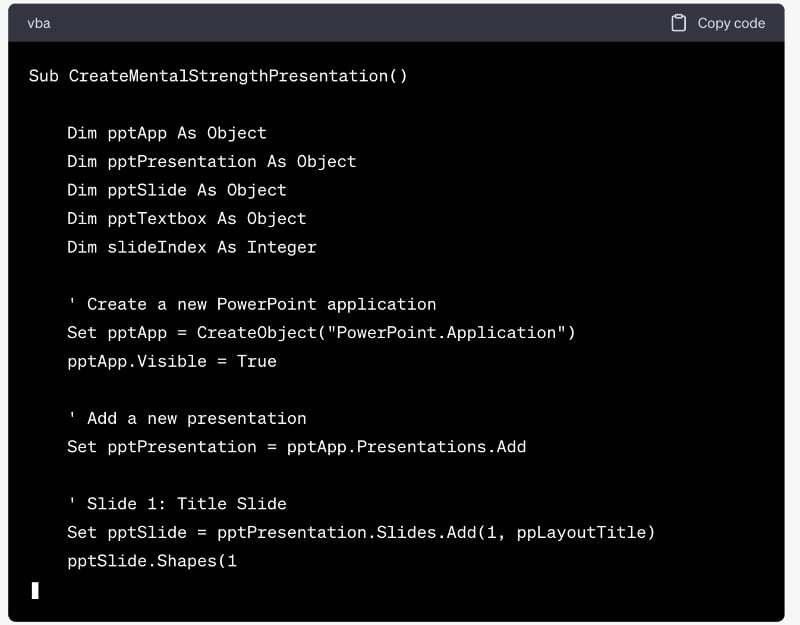 ChatGPT를 열고 다음과 같은 텍스트 프롬프트를 만듭니다. 정신적으로 강해지는 방법에 대한 VBA 프레젠테이션을 만듭니다. chatGPT는 VBA 프레젠테이션 코드를 생성합니다. 코드를 복사하여 Microsoft PowerPoint 앱으로 가져올 수 있습니다. 아래 단계를 따르세요.