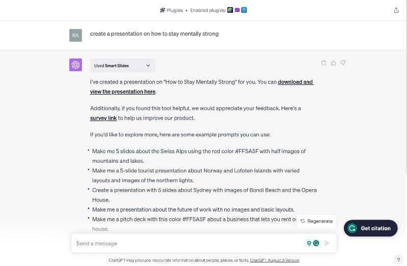 필요에 따라 플러그인을 선택할 수 있습니다. 이 경우에는 Smart Slides Presentation Generator 플러그인을 사용하고 있습니다. 플러그인을 설치한 후 텍스트 프롬프트를 활성화하고 입력하여 프레젠테이션을 만들 수 있습니다. 플러그인은 자동으로 프리젠테이션을 생성하고 프리젠테이션을 다운로드할 수 있는 링크로 응답합니다. 프레젠테이션을 다운로드하여 모든 프레젠테이션 프로그램에서 볼 수 있습니다.