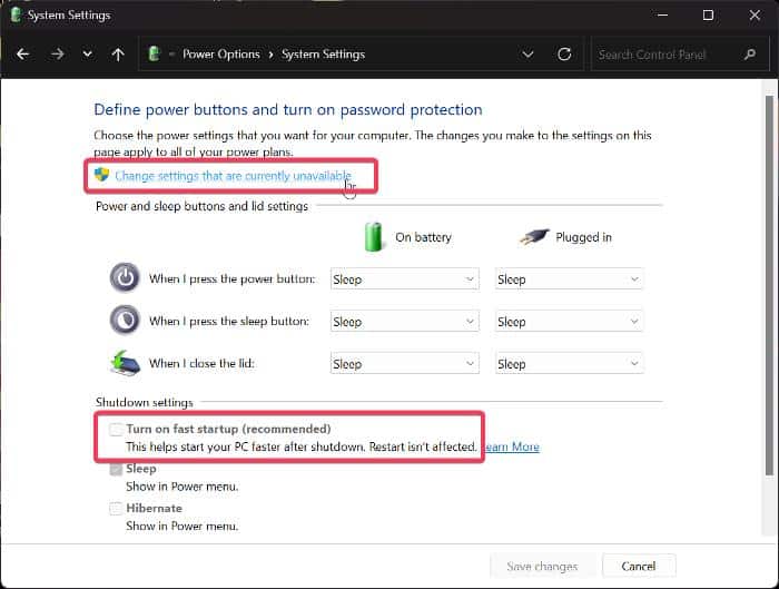 4. 이제 현재 사용할 수 없는 설정 변경 옵션을 클릭한 다음 종료 설정 아래에서 빠른 시작 켜기 옵션을 선택 취소합니다