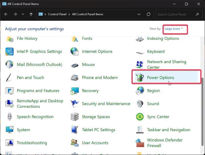 2. 제어판 창에서 보기 기준 옵션을 큰 아이콘 으로 설정한 다음 전원 옵션 으로 이동하여 클릭합니다.