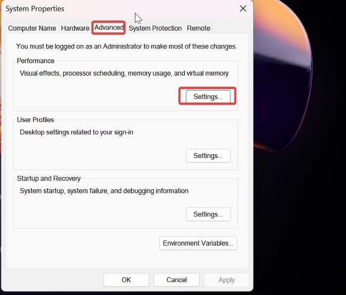 3.. 시스템 속성 대화 상자 에서 고급 탭을 선택한 다음 성능 섹션 에서 설정을 클릭합니다
