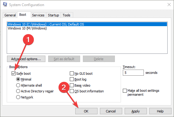 4. 부팅 탭으로 이동하여 안전 부팅을 선택 하고 확인을 클릭합니다. 그러면 안전 모드에서 컴퓨터가 다시 시작됩니다.