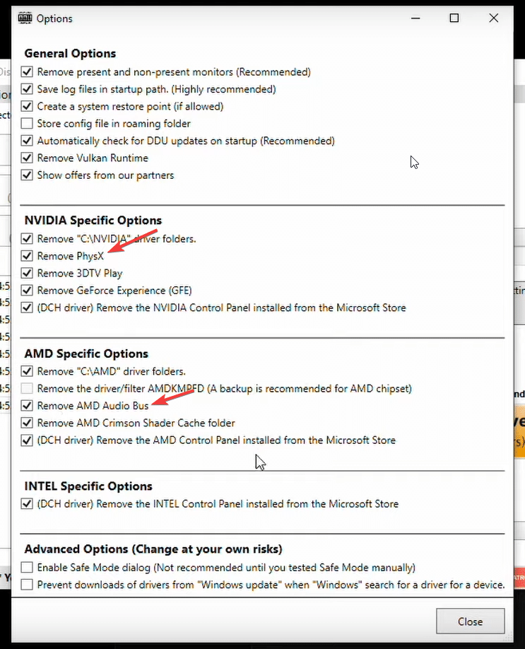 6. DDU를 시작한 후 Nvidia 및 AMD 아래의 모든 옵션을 선택한 다음 닫기를 누릅니다