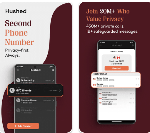 Hushed를 사용하면 3개 국가 (미국, 영국, 캐나다)에 걸쳐 300개가 넘는 지역 코드에 걸쳐 있는 가상 전화번호를 선택할 수 있습니다