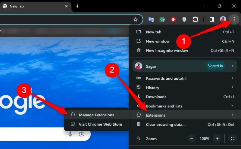 - 오른쪽 상단에 있는 점 3개 메뉴 아이콘을 클릭하고 확장 프로그램을 선택한 다음 확장 프로그램 관리를 클릭합니다