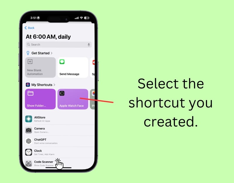 - 15단계: '내 단축키'에서 생성한 애플 워치 페이스 단축키를 선택하세요.