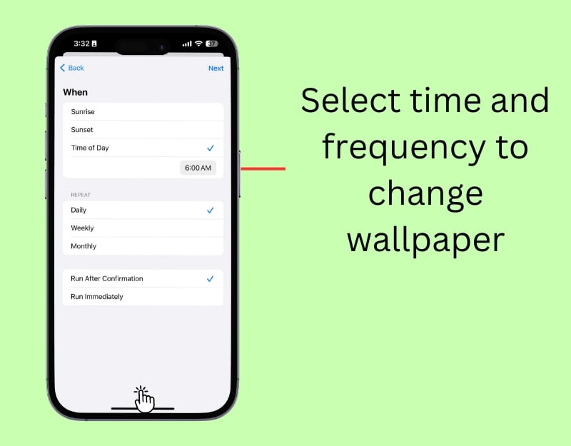 - 13단계: 이 자동화를 언제 실행해야 하는지에 대한 옵션이 표시됩니다. 잠에서 깨거나 점심을 먹는 시간 등 하루 중 특정 시간을 선택하거나 장소에 도착하거나 떠나는 시간 등 위치 트리거를 선택할 수 있습니다. 메시지 수신, 이메일 수신 등 특정 이벤트가 발생할 때 배경화면이 변경되도록 설정할 수도 있습니다. 배경화면을 매일 변경하려면 ' 시간대 '를 선택하세요 '