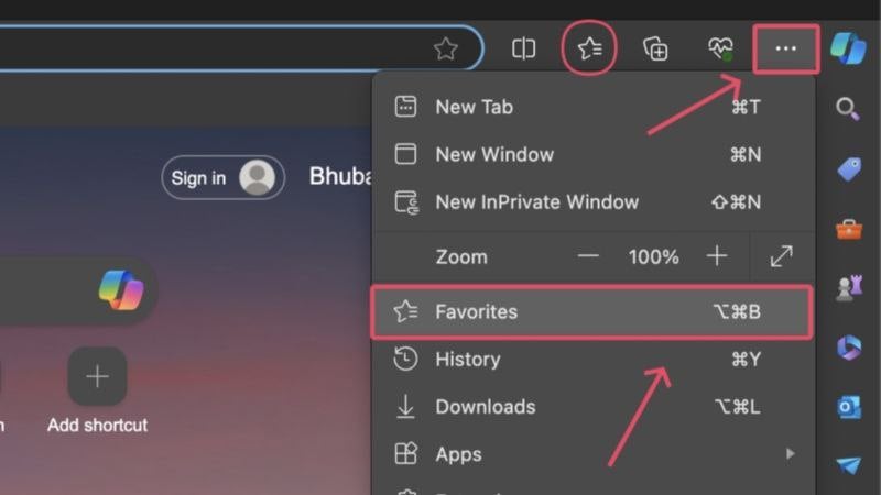 - 드롭다운 메뉴에서 미트볼 메뉴 아이콘(⋯)을 클릭 하고 즐겨찾기 내보내기를 선택합니다. 또는 edge://favorites/를 방문하여 동일한 단계에 따라 즐겨찾기를 내보낼 수 있습니다.