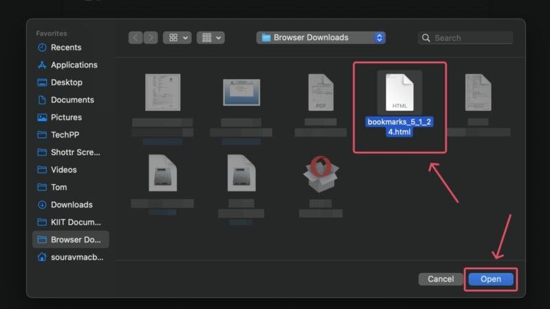 - 드롭다운 메뉴에서 북마크 HTML 파일을 선택해야 하는 새 창이 열립니다 . 파일 선택 을 클릭합니다 .