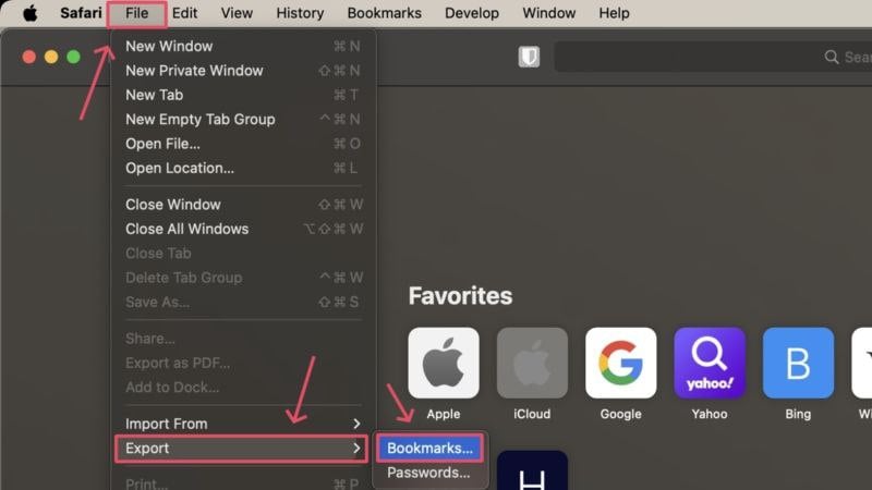 - Mac에서 Safari를 엽니다 . 메뉴 표시줄에서 파일 아이콘을 클릭 하고 내보내기 위에 커서를 놓습니다 . 드롭다운 메뉴에서 북마크…를 선택하세요 .