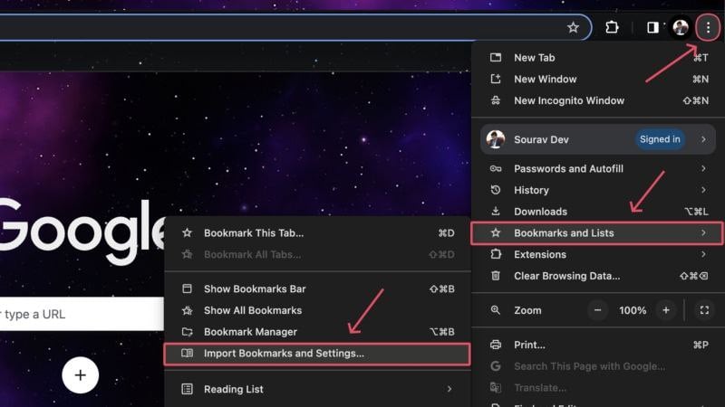 수동 측면으로 들어가기 전에 대부분의 브라우저에는 이전 브라우저에서 북마크를 원활하게 전송할 수 있는 기능이 내장되어 있음을 알려드립니다. 북마크 및 기타 설정을 전송하는 빠르고 원클릭 작업입니다.