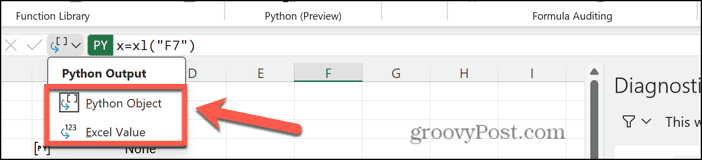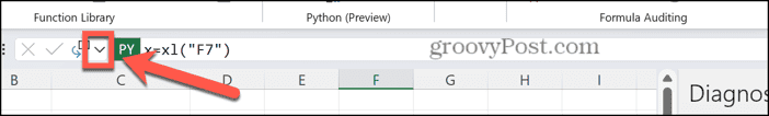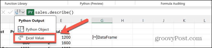 - 수식 입력줄 왼쪽에 있는 아래쪽 화살표를 클릭 하고 Python 출력 으로 Excel 값을 선택합니다.