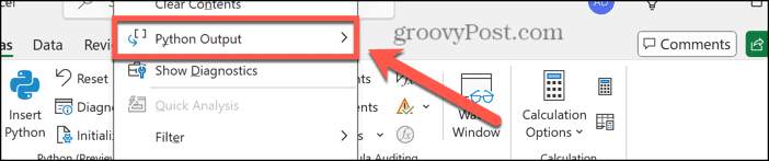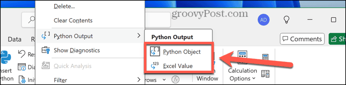 - Python이 포함된 셀을 마우스 오른쪽 버튼으로 클릭하고 Python 출력을 선택할 수도 있습니다.