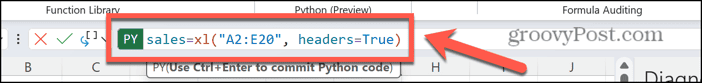 셀에서 Python 코드를 편집해야 하는 경우 수식 막대에서 편집할 수 있습니다. 기본적으로 수식 막대는 한 줄만 표시하므로 Python 코드에 여러 줄이 있는 경우 수식 막대를 확장하여 모두 표시해야 합니다. 코드를 더 추가하려면 Enter를 사용하여 새 줄을 추가하고 Ctrl+Enter를 사용하여 커밋할 수 있습니다.