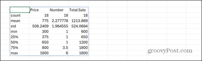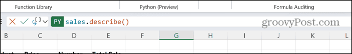 - 또 다른 빈 셀을 선택하고 =PY(sales.describe())를 입력하여 sales를 데이터 세트에 지정한 이름으로 바꿉니다.